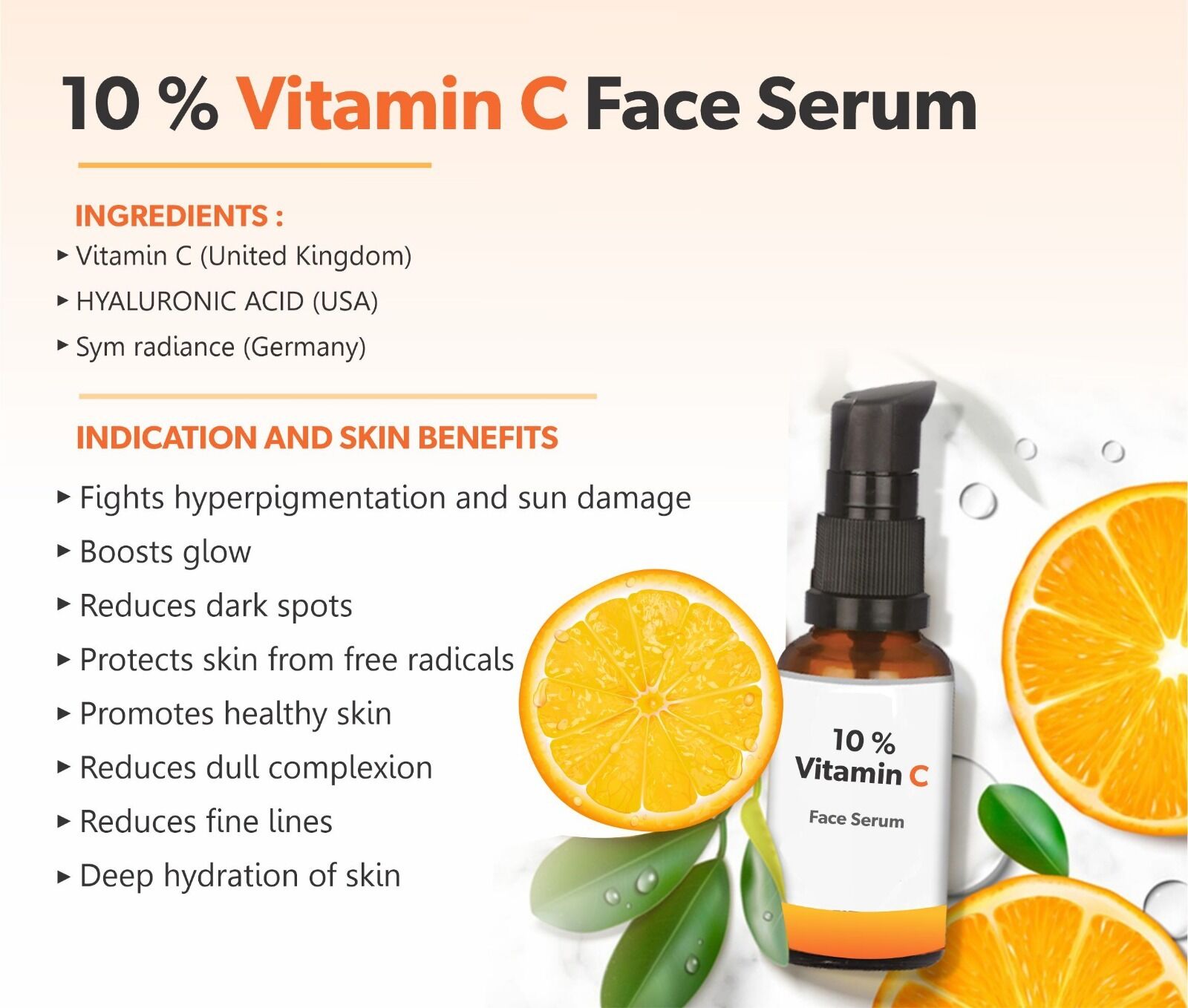 Vitamin C face serum is a skincare product with a lot of vitamin C, which helps protect your skin. This serum makes your skin brighter, evens out skin tone, reduces dark spots and makes your skin look younger by making more collagen. Vitamin C face serums are used in the morning to protect the skin from damage and ageing, before putting on moisturizer and sunscreen. You should keep vitamin C serums in a cool, dark place so they stay effective.